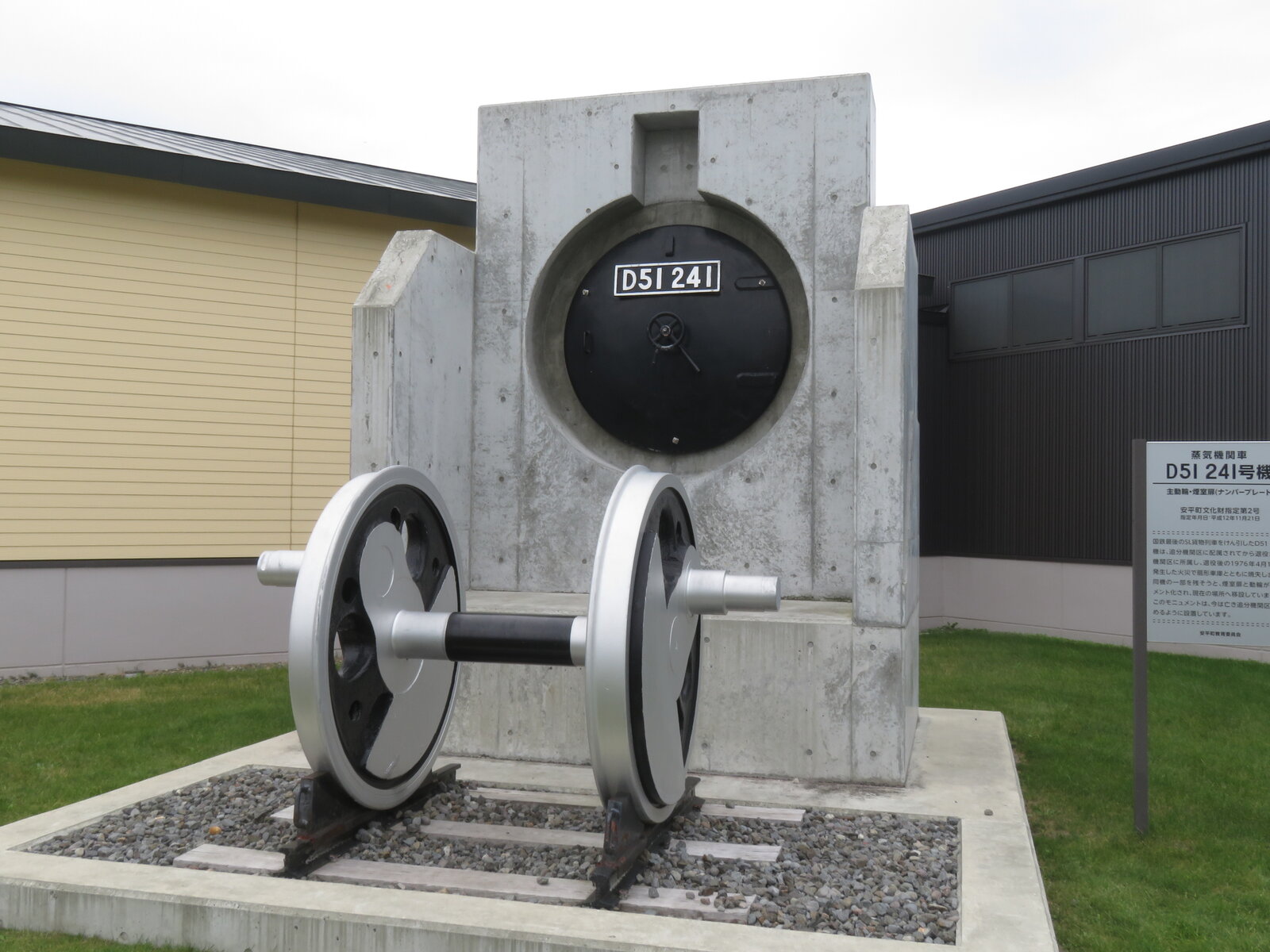 実車の動輪と燃室扉がモニュメントとして展示されています。