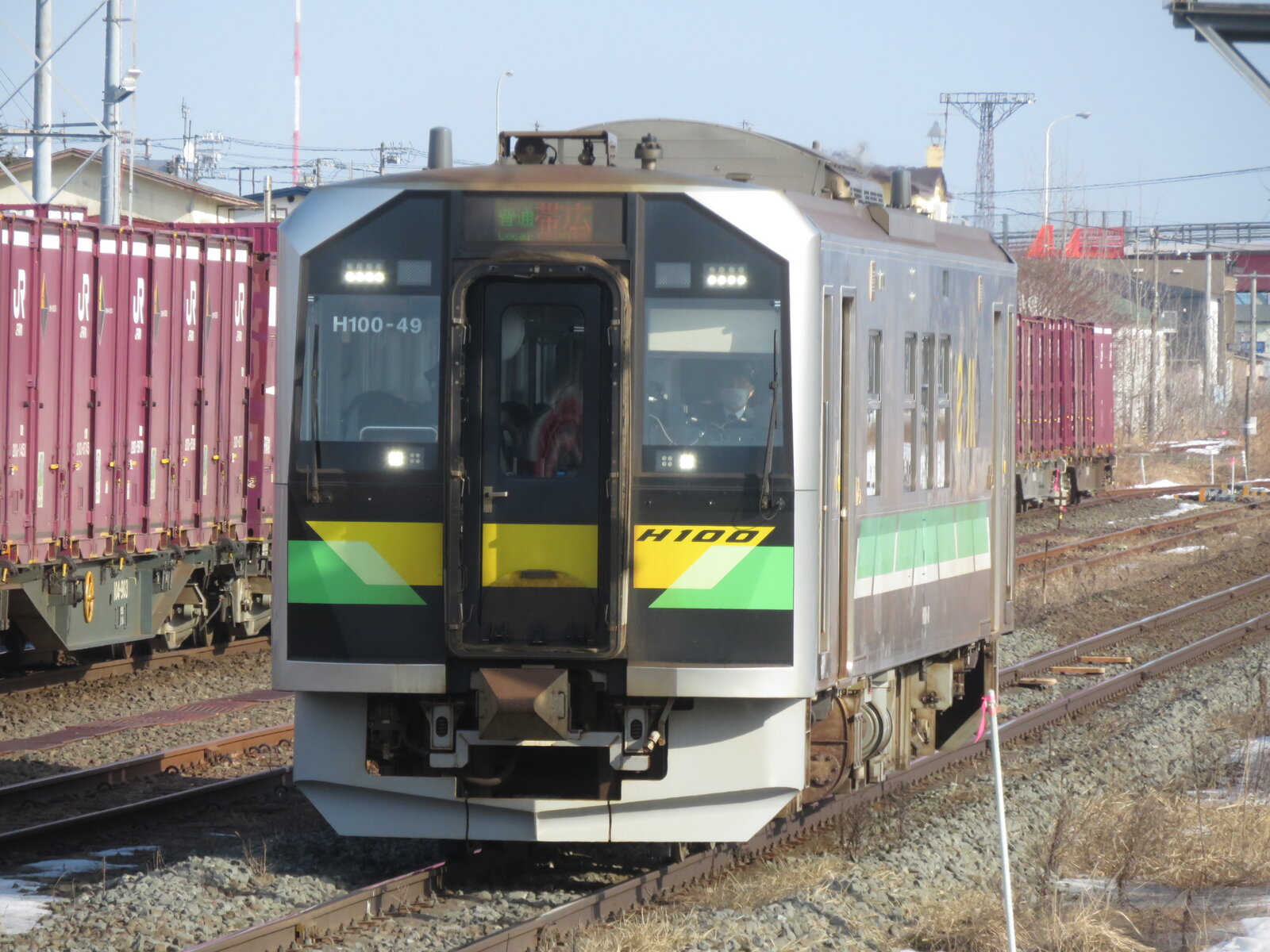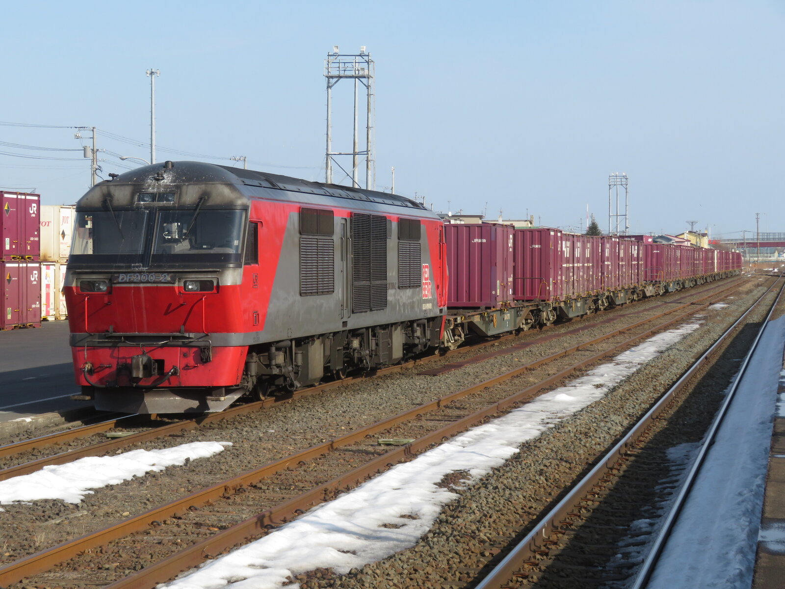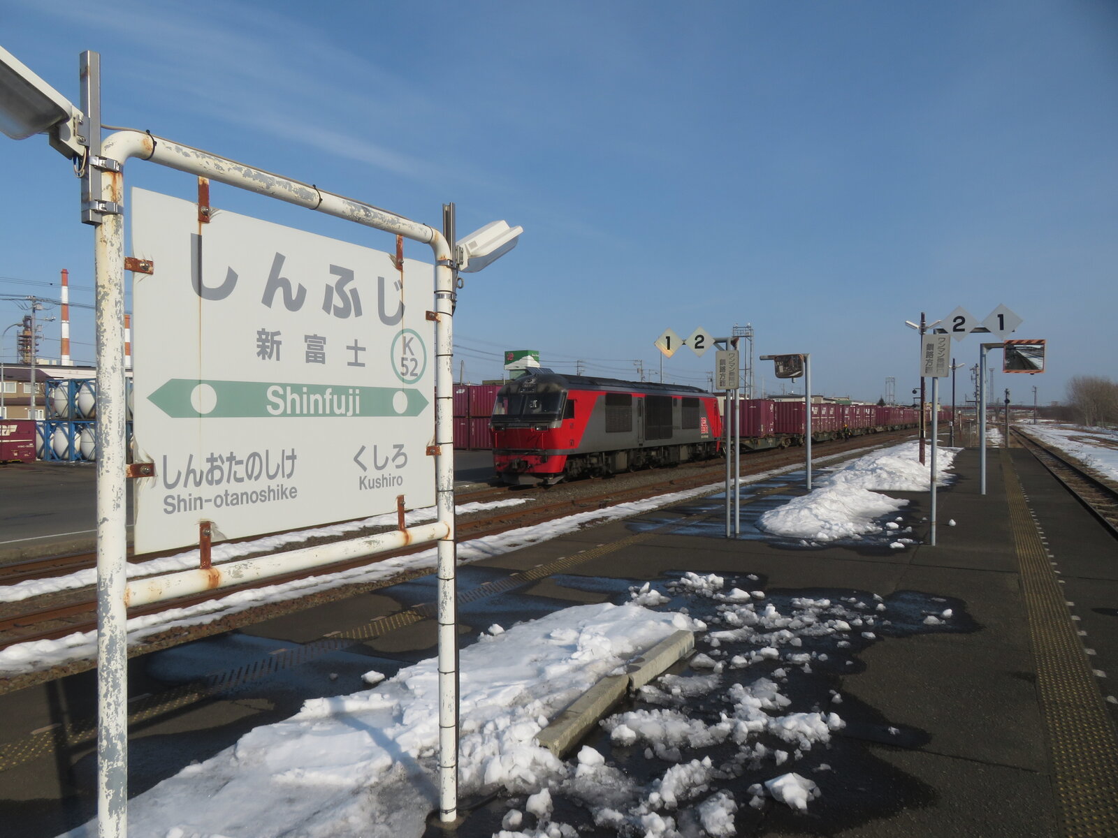 2025年03月15日 釧路貨物駅 釧路貨物駅に停車するDF200牽引のコンテナ貨物です。こちら釧路貨物駅は根室本線の新富士駅に隣接しています。新富士駅の入り口はなんとも簡素な造り、無人駅で駅舎母屋はなく階段でホームへ。1面2線の島式ホームとなっています。以前はここから日本製紙の専用線が分岐していました。普通列車はH100に置き換えられたまにキハ54が入っているようです。1時間待ちで目当ての釧路行きがようやくやってきました。このあたりの普通列車は限りなく少ないです。 「鉄道」カテゴリの最新記事 < 前の記事次の記事 > コメント コメントフォーム 名前 コメント 記事の評価 リセット リセット 顔 星 情報を記憶 コメントを投稿する